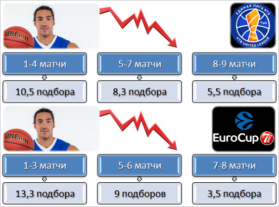 Причем, до этого в Единой лиге у него было 7 подряд игр с двузначной результативностью и в Еврокубке - 6. В трех же последних играх он набирал лишь 7, 5 и 8 очков соответственно. Напомню, что все эти три игры проиграны.