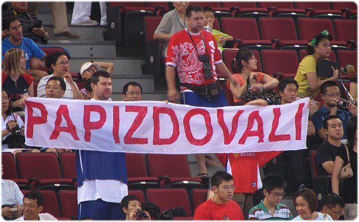 Мы с женой вместе ездим, по возможности. Кстати, про баннер «Papizdovali». Это коллективное творчество, но сделала баннер моя жена. Мы не хотели публичности, хотели просто завести команду. Я поехал в Пекин, Заказчику сказал: еду в командировку. Через три недели вернулся, Заказчик зовёт меня к себе в кабинет, достаёт из сейфа распечатанную фотку с яплакал.ру со мной и этим баннером: «Это твоя командировка, Ярик?» Кто это фотографировал, я не знаю, но сейчас это уже фишка баскетбольных болельщиков сборной России. Мы и шарфы сделали такие.